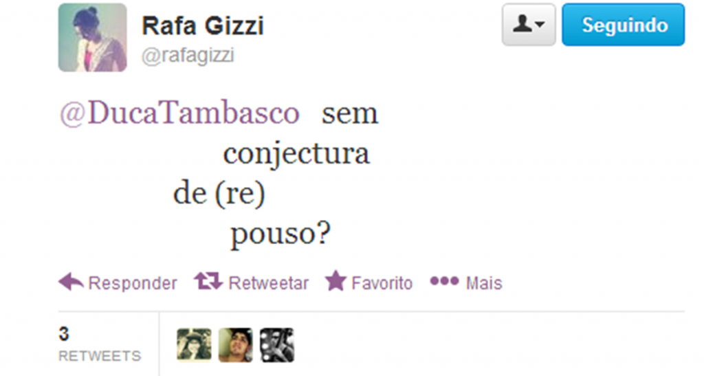Duca decidiu tocar a vida e recentemente iniciou um relacionamento com a jovem poeta Rafa Gizzi.