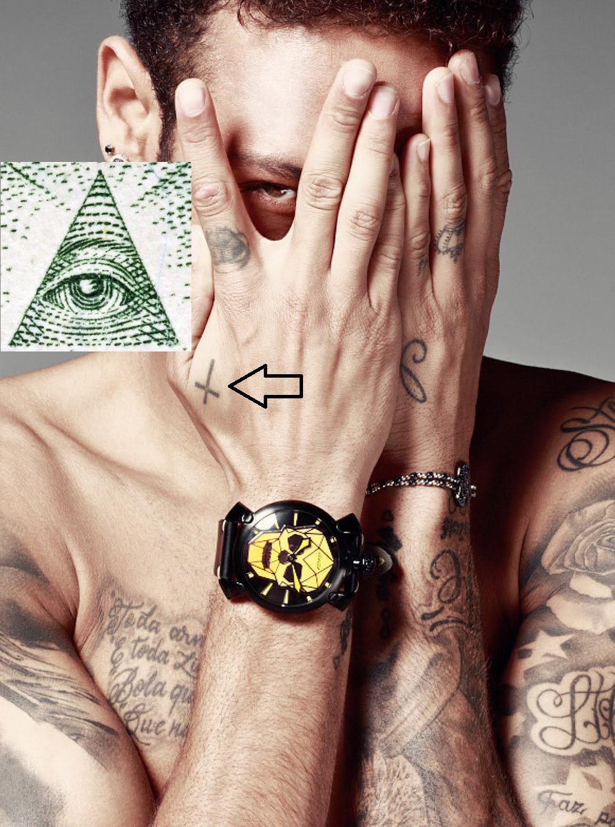 Nessa imagem, além de fazer um dos símbolos maçônicos mais usados entre famosos que são assumidamente ligados aos chamados Iluminatis, o “Olho de Horus”, ou “O Olho que tudo vê”, Neymar também tem na mão a tatuagem de uma cruz. Na foto, a cruz acaba ficando invertida, representando um dos símbolos satanistas medievais.
