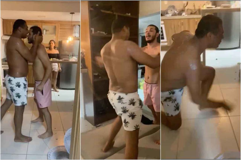 Nas imagens também aparece outra mulher, enquanto uma quarta pessoa filma a confusão. Fabrício aparece segurando uma garrafa de wisky e empurra Lucas diversas vezes.