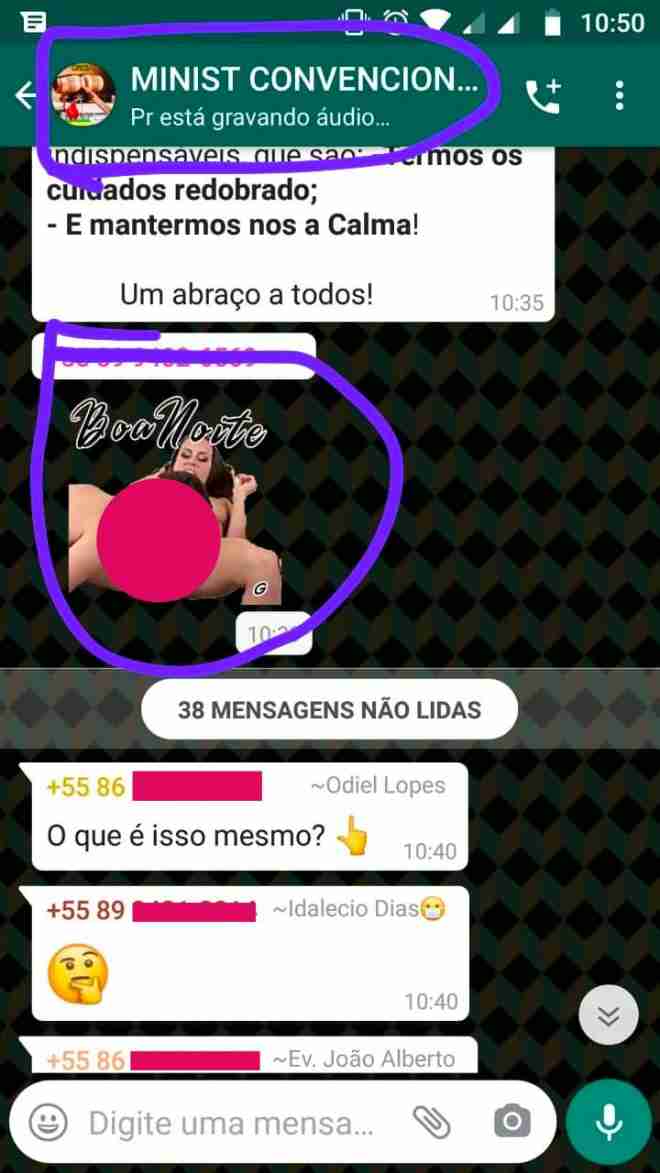 Durante uma conversa, um pastor postou uma figurinha pornográfica, e embora alguns pastores tenham questionado ela, outros teriam se calado.