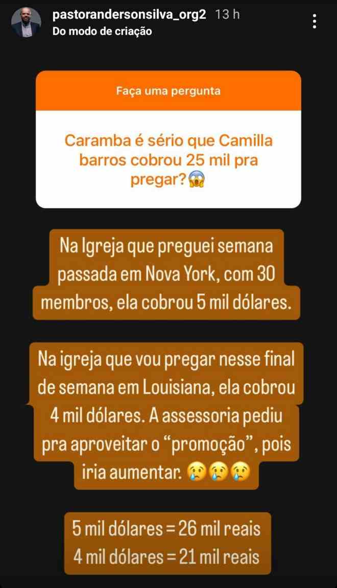 Nos últimos dias, uma polêmica tomou conta das redes sociais envolvendo a pastora Camila Barros e o pastor Anderson Silva. Tudo começou quando Silva denunciou, em seu perfil no Instagram, que a pastora teria cobrado valores exorbitantes para pregar em duas igrejas nos Estados Unidos.
