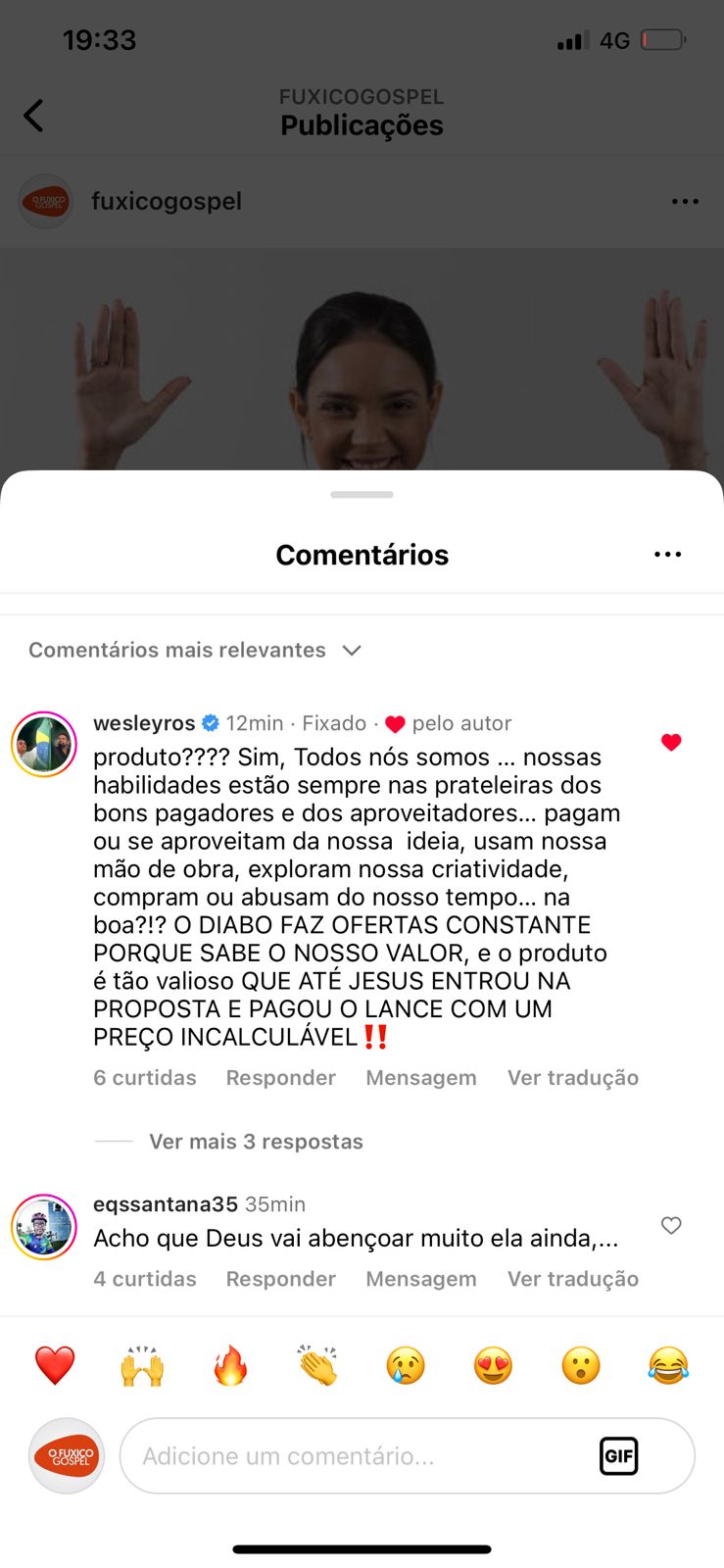 O pastor e cantor gospel Wesley Ros fez um comentário controverso em uma publicação do nosso perfil do Instagram, que perguntava aos internautas se a pregadora Vitória Souza era um produto.