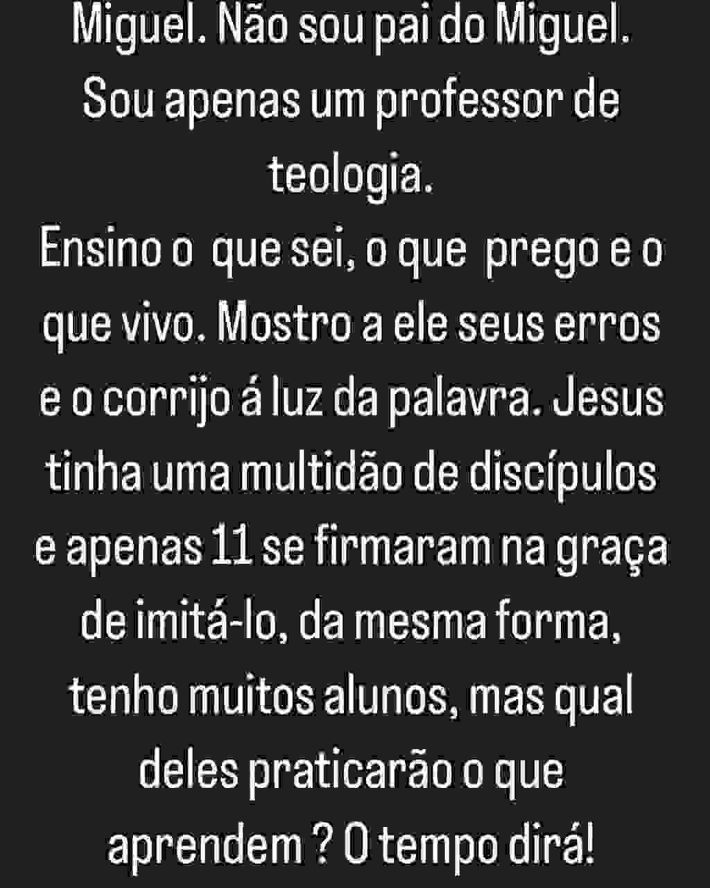 “Queridos, não sou pastor do Miguel. Não sou pai do Miguel. Sou apenas um professor de teologia. Ensino o que sei, o que prego e o que vivo. Mostro a ele seus erros e o corrijo à luz da Palavra.”
