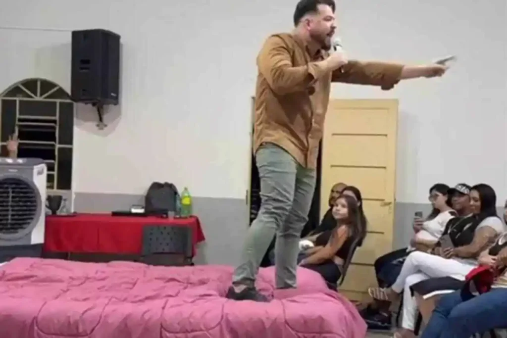 Em uma igreja localizada no Jardim Caiçara, um culto chamou a atenção por um elemento inusitado no altar: uma cama de casal. O responsável pela iniciativa é o apóstolo Mauro Ortiz, que justificou o gesto como um “ato profético” para despertar a fé e resgatar os sonhos dos fiéis.